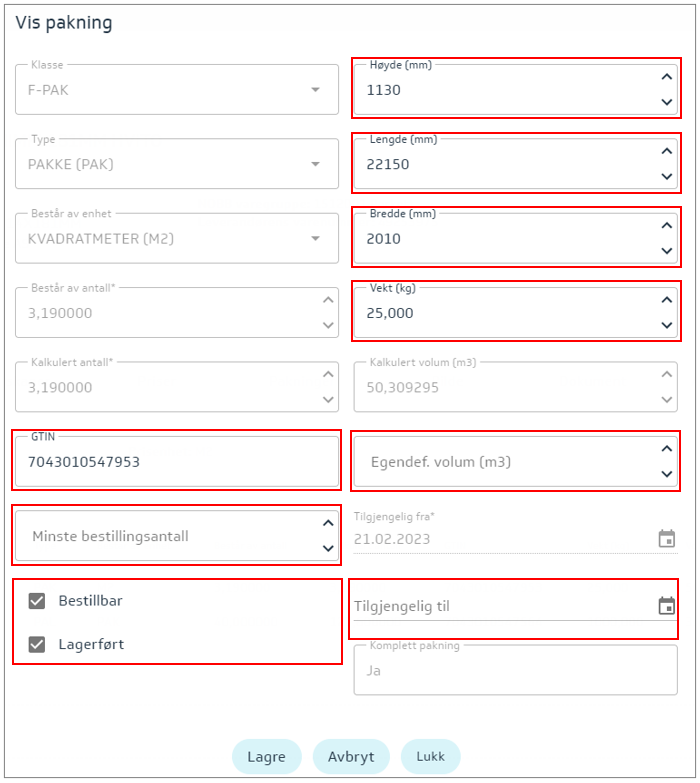 Note! The weight of the packaging must be at least the weight of the packaging it consists of, multiplied by the value in the Consists of count field.