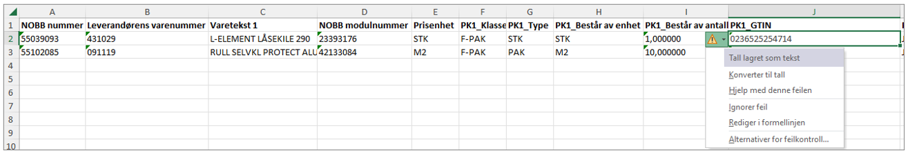 If you are going to import a GTIN number with a leading zero, the column (example: for F-pack PK1_GTIN) must be formatted as text.