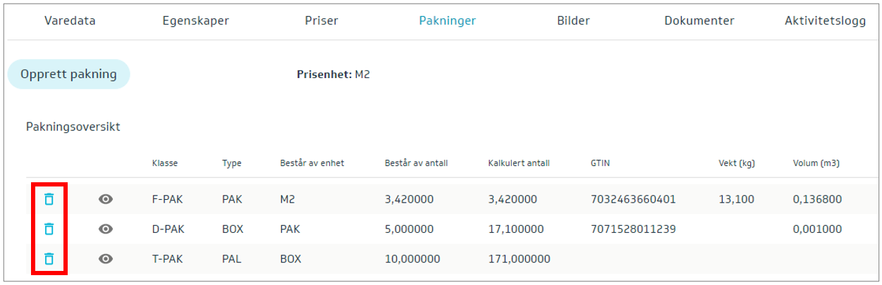 You cannot delete published (approved) packaging. Packaging must be withdrawn by setting a discontinuation date – Available to.