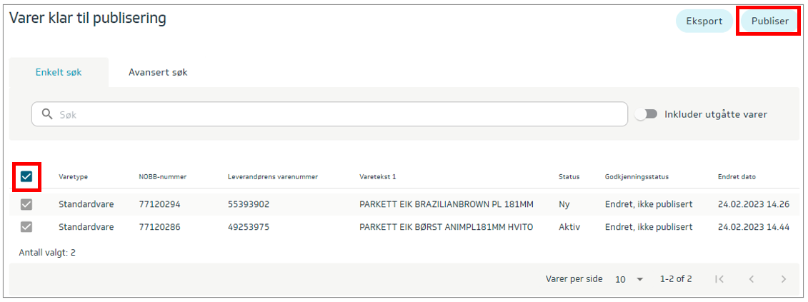 To publish (send for approval), select the desired items and click the "Publish" button.
