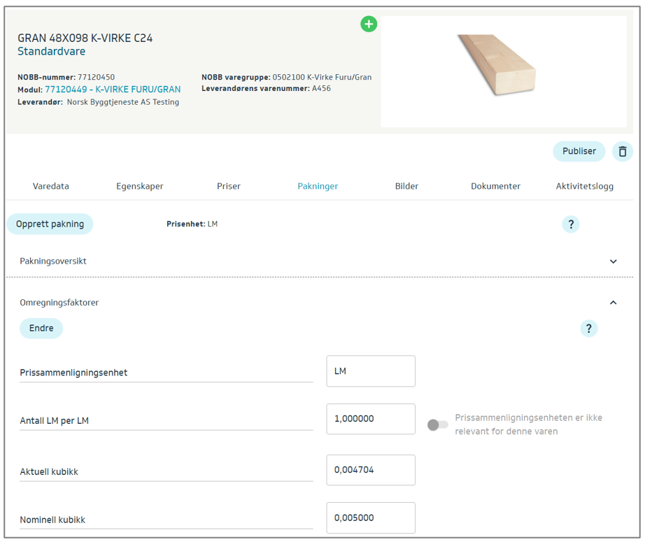 The data fields for actual and nominal cubic meters are found under the product in Packages → Conversion Factors, and are only available for products related to timber.