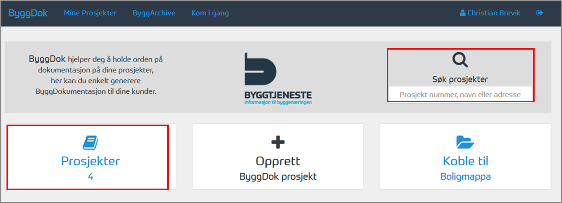 Trykk på boksen Prosjekter, eller skriv inn prosjektets navn i søkfeltet: