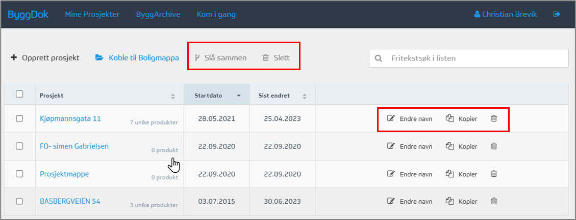 Du vil få opp en liste på alle prosjekter som har blitt opprettet. Du har muligheten å slå sammen, slette, endre navn og kopiere prosjekter. Prosjektene vil eksistere så lenge du har en konto i ByggDok.
