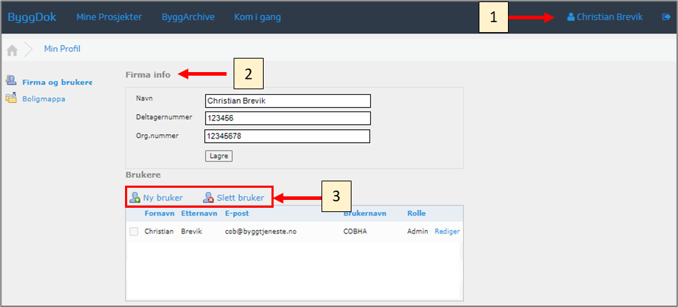Du har mulighet å opprette nye eller slette brukere under Brukere (3). Det er viktig at du huker av for Firma Admin hvis personen du gir tilgang til skal ha muligheten til å gjøre endringer.