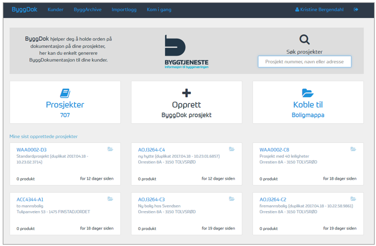 På den første siden vises tre bokser Prosjekter, Opprett Prosjekt og Opprett Boligmappa prosjekt.
