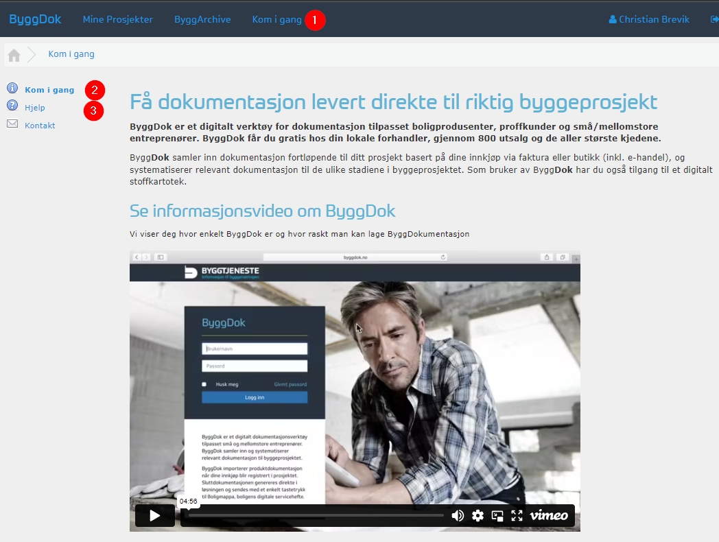 Etter at du er innlogget i ByggDok ligger “Kom i gang (1,2)” og “Hjelp (3)” her: