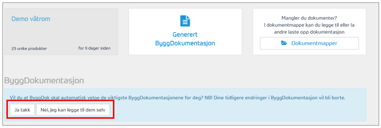 På den første siden gir ByggDok deg mulighet til å bruke et filter for hvordan du ønsker byggdokumentasjonen skal velges.