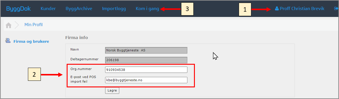 Når en XML-melding feiler, kalles det en POS import feil. Hvis dette skjer sendes en e-post (2) til adressen oppgitt i feltet E-post ved POS Import feil. Import feilen medfører at dokumentasjonen ikke legges i riktig prosjekt.