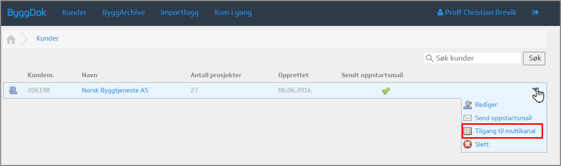 Vi har gjort det tilgjengelig for butikkansatte å gi proffkunden Tilgang til Multikanal. Velg Tilgang til multikanal og trykk OK, da har kunden en samlet oversikt over alle prosjekter fra alle butikker, og ikke bare de som er blitt opprettet i din butikk.