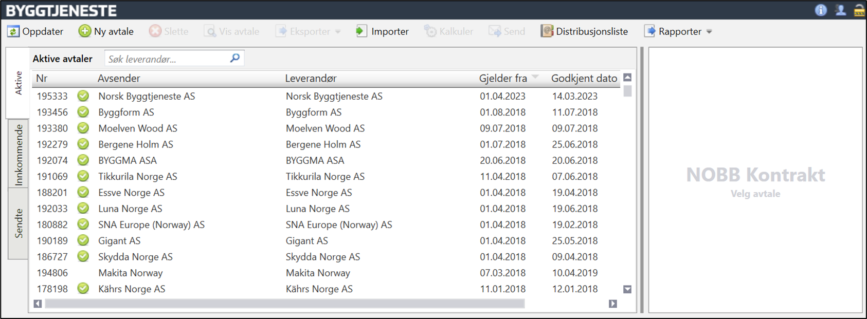 Etter pålogging i NOBB Kontrakt kommer man inn i dette skjermbildet. På venstre side vises tre faner «Aktive», “Innkommende “og «Sendt».