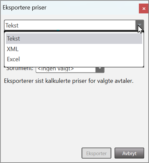 Du kan eksportere kalkulerte priser til fil for én eller flere avtaler. Forutsetningen for dette er at avtalene er kalkulert før du eksporterer.