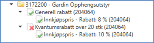 En forutsetning for å kunne kalkulere priser er at rabattbetingelsene og rabattelementene er satt aktive. Dette vises i avtalen ved et rødt kryss (indikerer at betingelsen er inaktiv) eller en grønn hake (indikerer at betingelsen er aktiv).