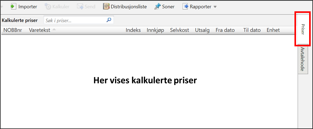 I fanen “Priser” til høyre i skjermbildet vises de kalkulerte prisene, disse er kun basert på betingelser som er satt som aktive.