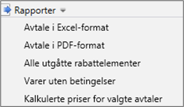 Kalkulerte priser for valgte avtaler. Denne rapporten eksporterer alle varer med kalkulert pris. Rapporten er et godt grunnlag for kontroll av at rabatter og priser er riktig registrert. Husk å priskalkulere avtalen(e) før rapporten kjøres.