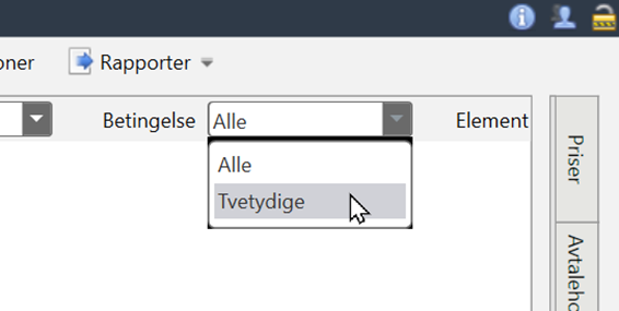 Dette gjøres ved å bruke filtreringsfunksjonen som finnes på verktøymenyen under «Betingelse». Her kan du velge «Tvetydige» for å sjekke eventuelle rabatter i avtalen som er mangelfulle eller overlappende.