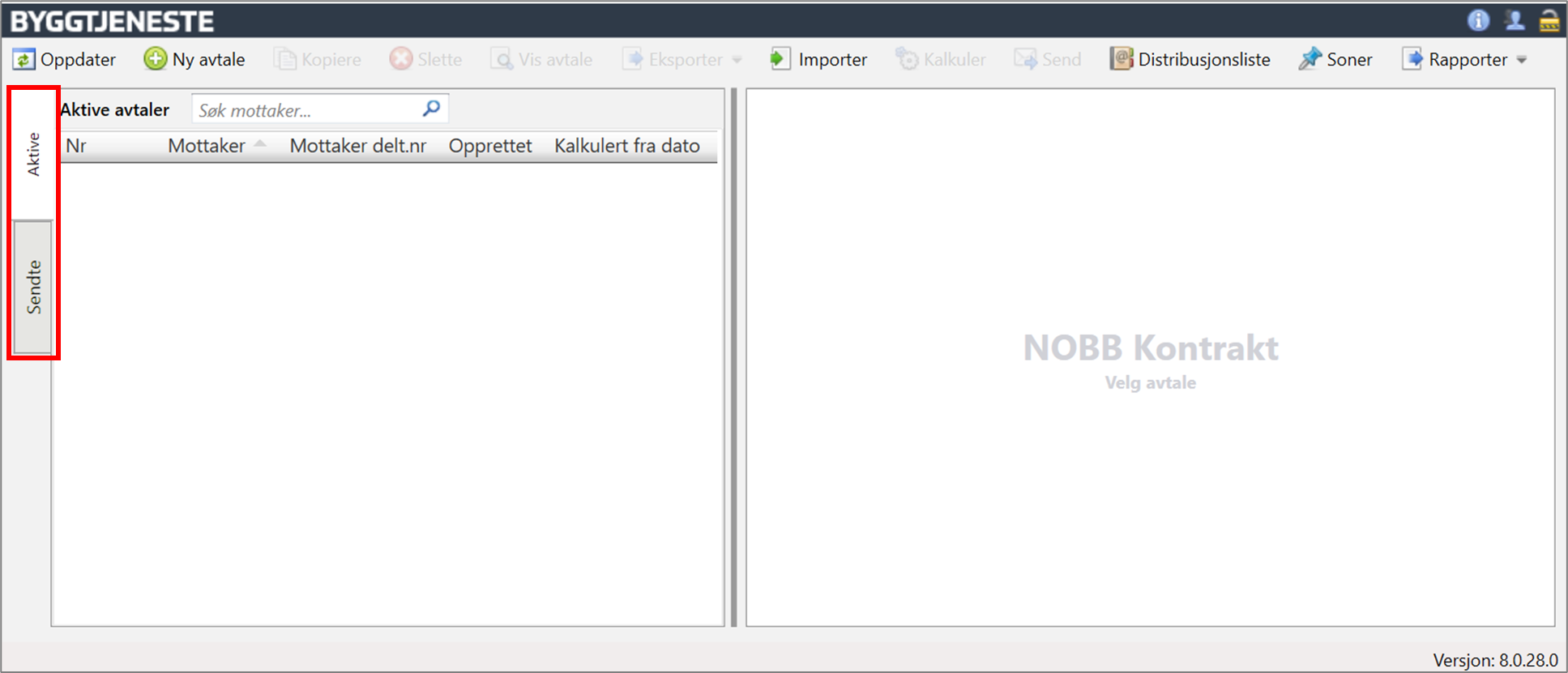Etter pålogging i NOBB Kontrakt kommer man inn i dette skjermbildet. På venstre side vises to faner «Aktive» og «Sendt».