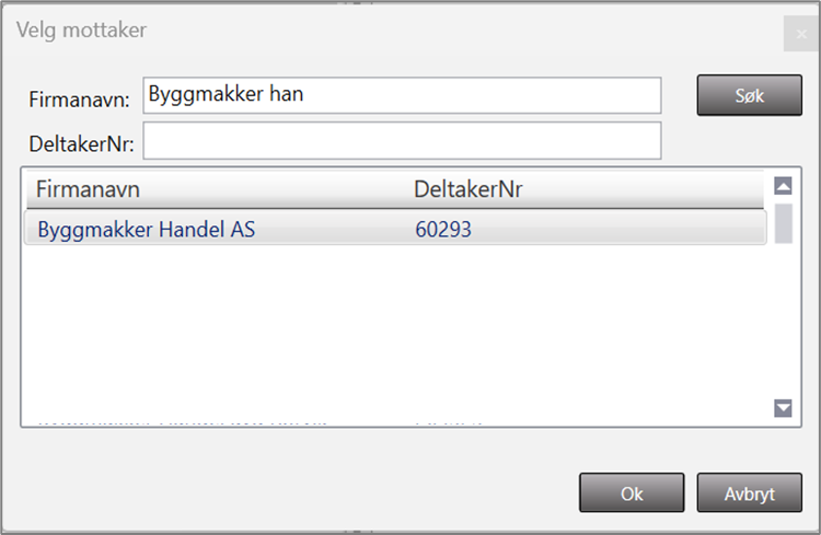 I skjermbildet som åpnes må du søke etter den som skal motta avtalen. Skriv navnet eller deltakernummeret, og trykk søk. Marker mottakeren i søkeresultatet og trykk OK.