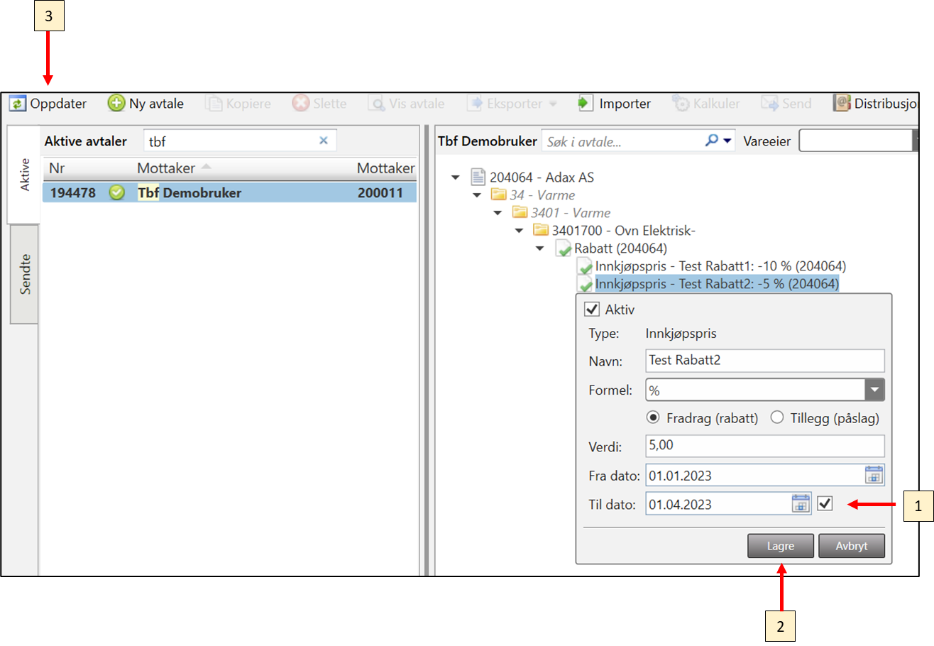 Ønsker man å fjerne «Til Dato» og nullstille feltet må man fjerne hake (1), lagre (2) og oppdatere (3)