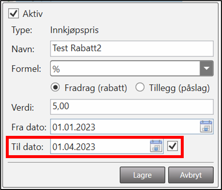 Alle utgåtte rabattelementer: Denne rapporten viser en oversikt over alle rabattelementer som har passert Til-dato.