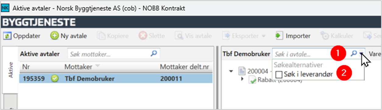 Om du for eksempel ikke finner et NOBB nr eller modul nr i NOBB Kontrakt avtalen, kan du bruke feltet “Søk i avtale»(1) og huke av boksen «Søk i leverandør» (2). Da vil du i hierarkiet finne hvor nobb nr eller modul ligger.