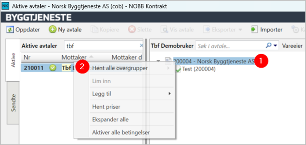 Alternativ kan du stå på leverandørnivå (1), høreklikke og hent alle overgrupper (2) , undergruppe, varegruppe osv. for å finne finne frem.