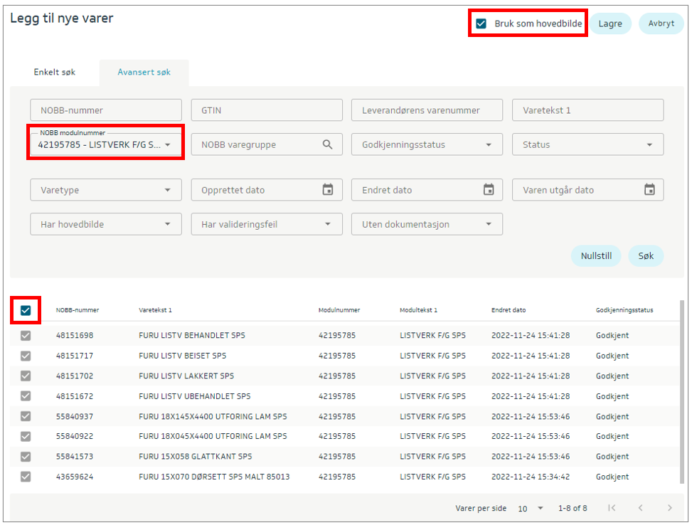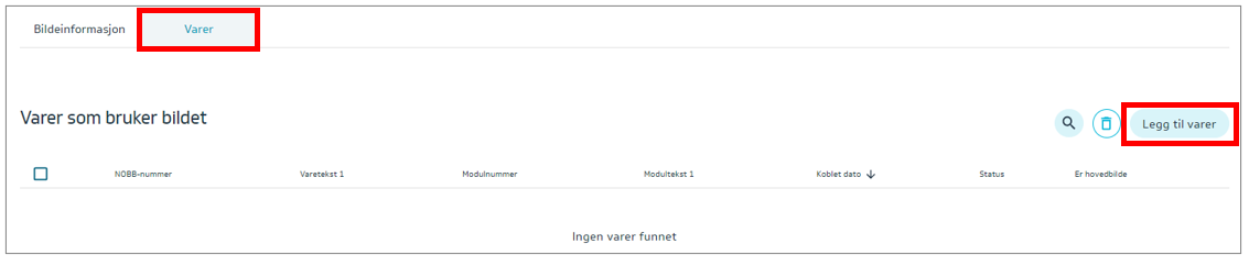 Søk etter NOBB modulnummer og marker varene som skal kobles til bilde.