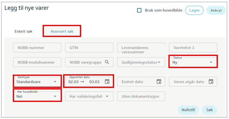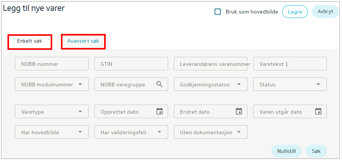 Enkelt søk: Her kan du søke på varetekst, varenummer, NOBB-nummer, GTIN. Du kan også lime inn en liste med NOBB-nummer for å finne aktuelle varer.