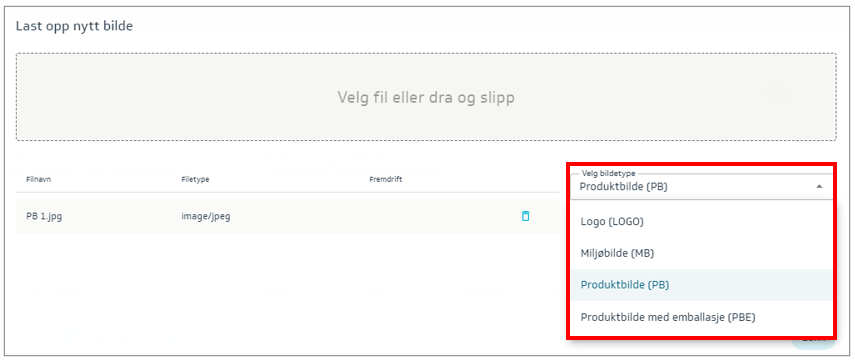 Last opp nytt bilde, velg fil og trykk Åpne. Velg bildetype (settes automatisk til produktbilde) og trykk Last opp.
