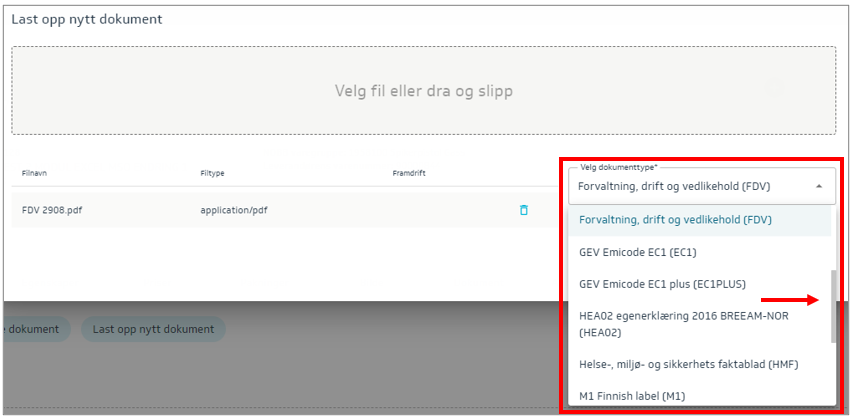 Last opp nytt dokument, velg fil og trykk Åpne. Velg dokumenttype og trykk Last opp. Bruk rullegardin for å se alle dokumenttypene.