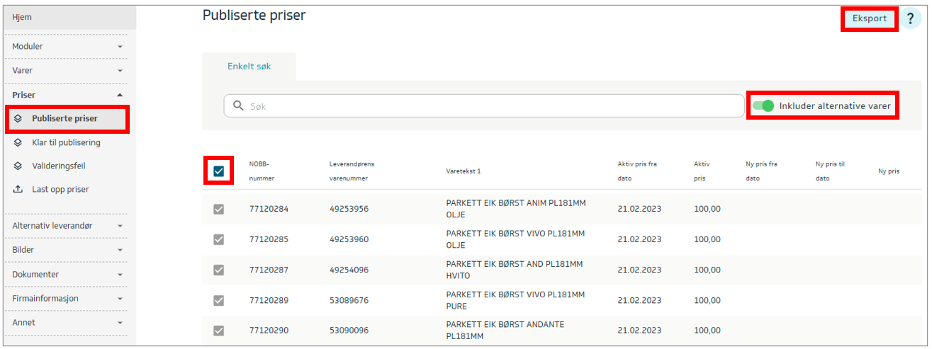 Priser eksporteres fra menyen Priser (filen kan ikke benyttes til import av priser, se mer hvordan laste opp priser: Last opp priser (prisimport av NOBB indekspris)).