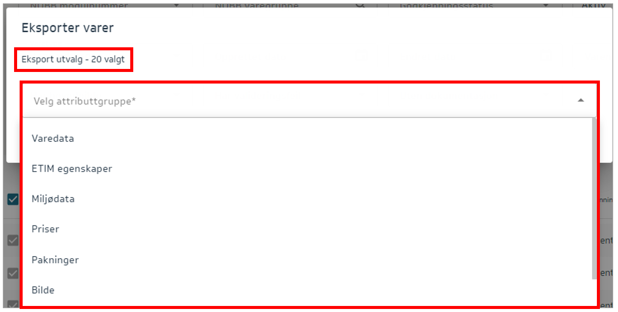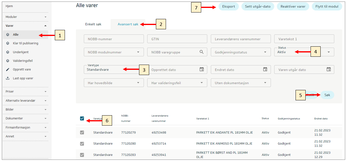 Varer kan eksporteres fra alle menyer som viser vare-lister.