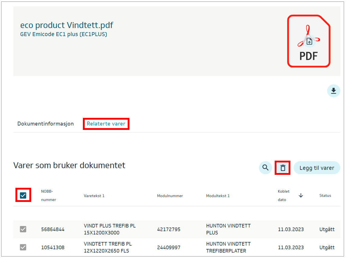 Hvis du ønsker å slette et dokument, må alle relaterte varer slettes først fra dokumentet: