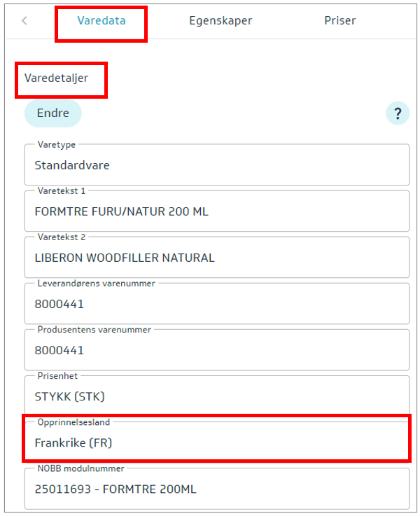 I NOBB Leverandør ligger datafeltet Opprinnelsesland under Varedetaljer: