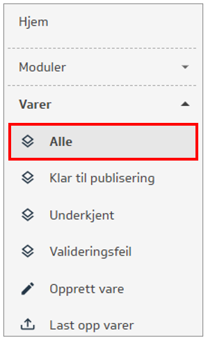 Når man laster opp nye varer fra Excel, vil disse alltid ha valideringsfeil fordi de mangler bilde. Disse finner du under menyen Varer - Alle: