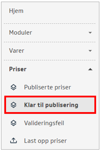 Dersom du laster opp nye priser og ikke velger at de skal publiseres automatisk, vil prisene vises under menyen Priser - Klar til publisering. Vær oppmerksom på at dersom du har lastet opp veldig mange priser vil det ta noen sekunder før oversikten viser alle prisene.