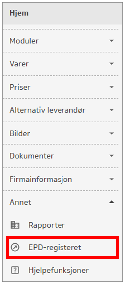 EPD-registeret finner man i NOBB Leverandør ved å klikke på menyvalget Annet – EPD-registeret: