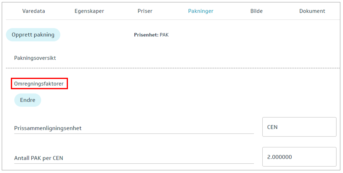 På skjermbildet vises et eksempel der prisenhet er PAK og prissammenligningsenheten er CEN. Verdien 2 betyr at man trenger 2 pakker for å få en CEN (100STK).