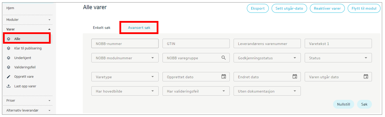 Her kommer oversikt over alle varer. Trykk på knappen Avansert søk.