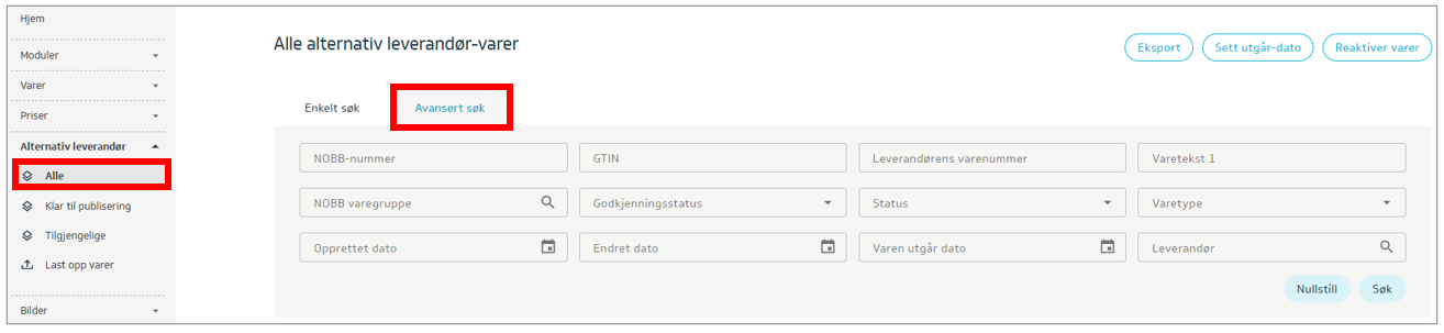 Her kommer oversikt over alle alternative varer. Trykk på knappen Avansert søk.