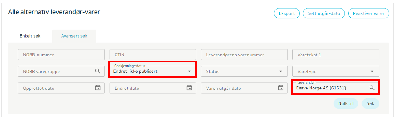 For eksempel: Alle alternative varer med godkjenningsstatus: Endret, ikke publisert for en leverandør: