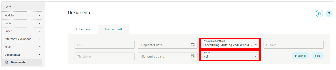 Her kommer oversikt over alle dokumenter. Trykk på knappen Avansert søk.