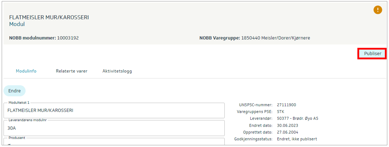 Hvis modul har status Endret, ikke publisert, kan du ikke gjøre endring på varen. Dette gjelder også for å opprette nye varer i modulen.