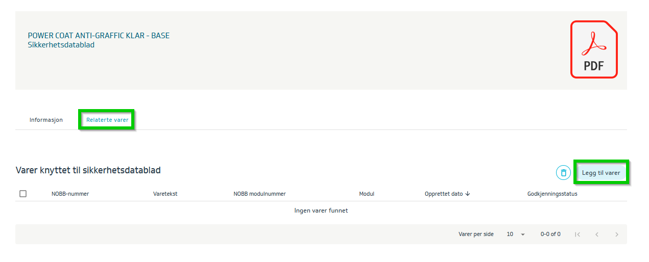Nå som SDS er ferdig registrert og godkjent kan relevante varer kobles til. Dette kan enten gjøres fra den enkelte vare, eller fra dokumentet.