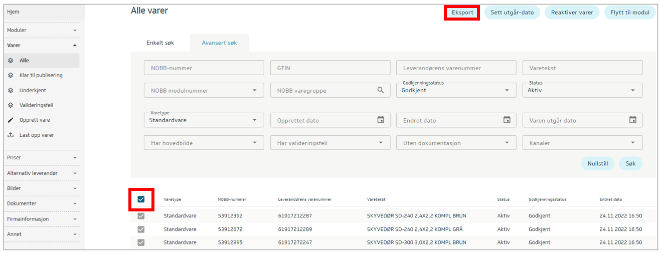 Marker varene og trykk på knappen Eksport: