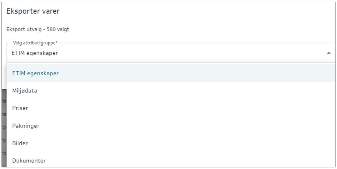 Velg attributtgruppe ETIM egenskaper og trykk på knappen Eksport.