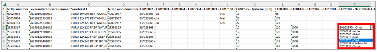 Noen datafelter har nedtrekksmenyer, for eksempel EF025109 - Overflatebehandling