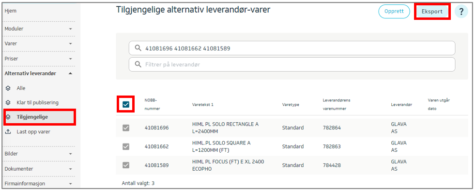 Finn varene du ønsker å være alternativ leverandør for, marker varene og trykk på knappen Eksport:
