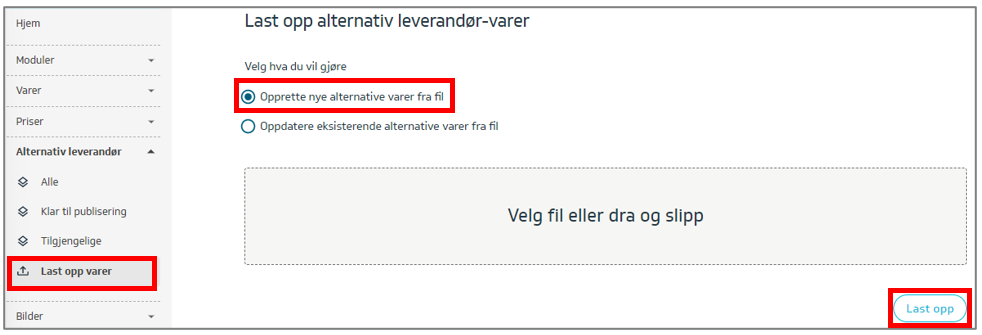 Trykk på knappen Last opp varer, velg fil fra din PC og trykk Last opp