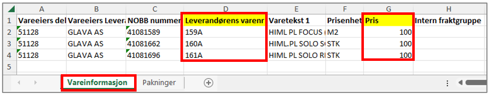 Ark Vareinformasjon: Legg til Leverandørens varenummer og Pris