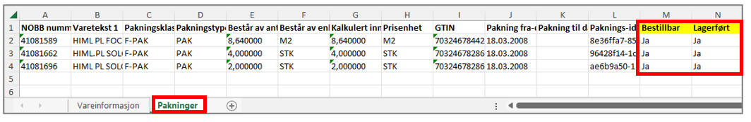Ark Pakninger: Legg til Bestillbar og Lagerført (Ja eller Nei) på alle pakninger